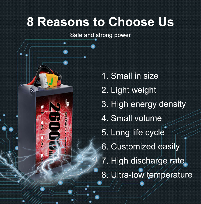 Deze batterij van vaste toestand is ontworpen om een revolutie teweeg te brengen in uw drone-ervaring. Met zijn hoge energiedichtheid kunt u verlengde vluchttijden en ongeëvenaarde manoeuvreerbaarheid bereiken. Of u nu een hobbyist of een marktleider bent, onze 16000 mAh -batterij is de perfecte metgezel voor uw luchtavonturen.