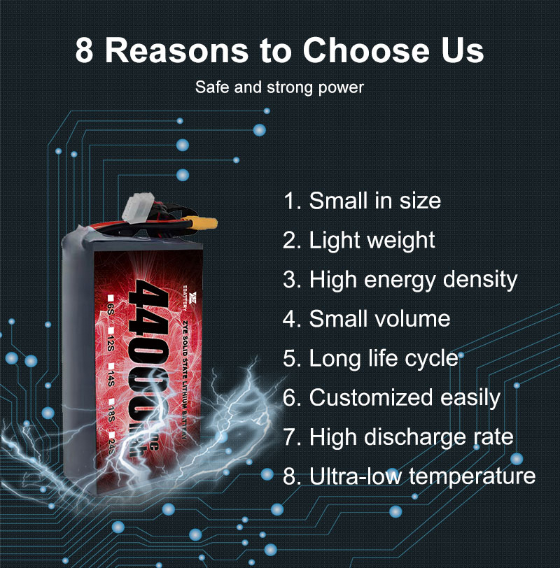 Geavanceerde technologie: we investeren in onderzoek en ontwikkeling om u de meest geavanceerde batterijoplossingen te bieden, inclusief onzeGroothandel Zye 3S 4S 6S 40000 MAH 44000 MAH 44AH 40AH12S24S Solid State Batterij Pack Ultra Light en lage temperatuurbestendige -40, ontworpen voor superieure prestaties in extreme omstandigheden.